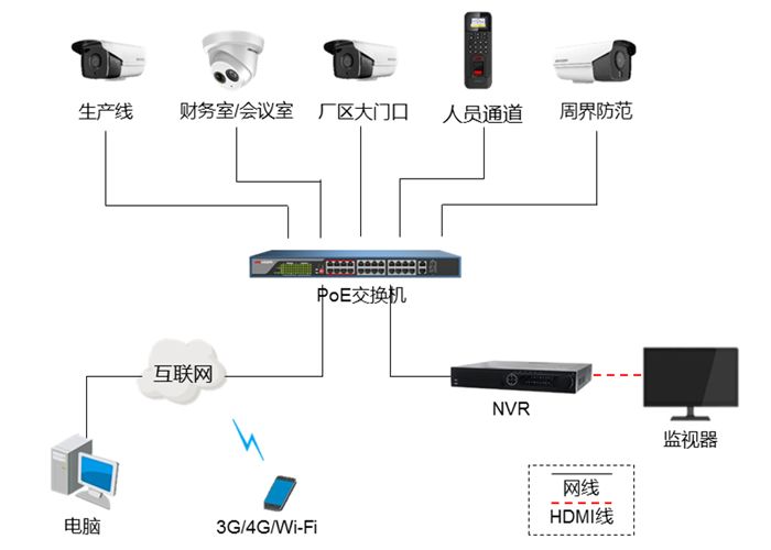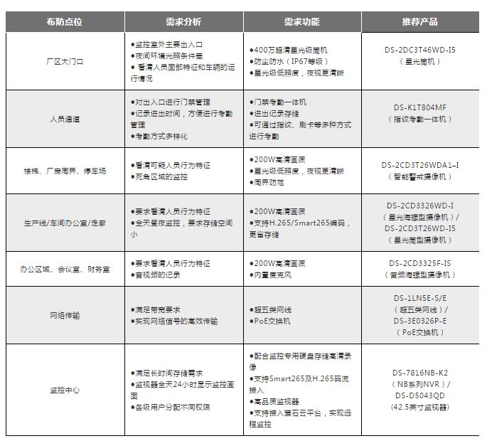 針對工廠的環(huán)境,我們設(shè)計了一套完善的安全監(jiān)控系統(tǒng),為工廠提供了一套可實施性較高的監(jiān)控解決方案。 本次方案的亮點在于應(yīng)用了剛發(fā)布不久的??低曋悄芫鋽z像機(jī)。該攝像機(jī)作為??低旳I Cloud邊緣智能的一員,是智能IPC家族中的明星產(chǎn)品,采用適用于視頻監(jiān)控場景的深度學(xué)習(xí)硬件及算法,具備精準(zhǔn)報警、實時警戒、快速回查三大功能。 01 配單選型 02 點位設(shè)計 下面列舉幾個具體的點位分析 周界防范 針對工廠的周界防范,由于周界及圍墻范圍較大,區(qū)域較廣,一般使用高圍墻包圍,采用??低?/span>智能警戒攝像機(jī),精準(zhǔn)報警,有效降低誤報率,當(dāng)場檢測到人或車時立即發(fā)出白光報警震懾,并實時遠(yuǎn)程上傳報警消息至手機(jī)或電腦,便于及時采取防范措施。 廠區(qū)大門口 對于廠區(qū)大門口,進(jìn)出車輛及來往人員十分眾多。這里我們推薦400W星光筒型攝像機(jī)。對門口進(jìn)行監(jiān)控,星光級照度,滿足日夜監(jiān)控的需求,適用于重要點位的監(jiān)控。 人員出入口 針對廠區(qū)人員管理,主要包括人員進(jìn)出權(quán)限管理和考勤打卡,這里推薦指紋門禁考勤一體機(jī),結(jié)合門禁管理與考勤管理于一體,安裝簡單,適用于主要出入口的人員管控。 生產(chǎn)線 廠區(qū)生產(chǎn)線作為工廠里的重要場景之一,在監(jiān)控系統(tǒng)中也十分關(guān)鍵。針對生產(chǎn)線的監(jiān)控,我們主推??低?span style="max-width: 100%; box-sizing: border-box; color: #040404; overflow-wrap: break-word !important;">星光級海螺/筒型攝像機(jī),該產(chǎn)品主要應(yīng)用于安防系統(tǒng)重點區(qū)域的監(jiān)控,其優(yōu)質(zhì)的成像效果和強(qiáng)大的環(huán)境適應(yīng)性,可以保證對整個生產(chǎn)線進(jìn)行全天候的監(jiān)控。 會議室/財務(wù)室 類似于財務(wù)室/會議室等區(qū)域是廠區(qū)的重點區(qū)域之一,人員密集,活動頻繁,且涉及到許多企業(yè)安全信息。我們推薦音頻海螺型攝像機(jī),外形小巧,功能強(qiáng)大,出廠自帶麥克風(fēng),支持音頻錄制,從而協(xié)助企業(yè)進(jìn)行內(nèi)部的信息安全管理, 03 系統(tǒng)拓?fù)?/strong> 04 系統(tǒng)亮點 全面防范:整套工廠視頻監(jiān)控系統(tǒng),覆蓋廠區(qū)周界、走廊、辦公室、生產(chǎn)線等方位,能全方位保障工廠安全??紤]到一般廠區(qū)較大,周界防范采用智能警戒攝像機(jī),精準(zhǔn)報警,有效降低誤報率。 簡單方便:本方案中大多為PoE設(shè)備。PoE設(shè)備只需布網(wǎng)線,無需鋪設(shè)電源線,省去部署供電系統(tǒng)和線路所需的時間、精力和花銷。 維護(hù)成本低:相比與非PoE方案,拓?fù)涔?jié)點少,維護(hù)概率低。 遠(yuǎn)程監(jiān)控:通過螢石云平臺,可以實時查看現(xiàn)場情況,回溯歷史錄像。布防時間內(nèi),當(dāng)警戒區(qū)域有人/車進(jìn)入,事件消息將第一時間推送至手機(jī)客戶端,管理人員可以通過手機(jī)查看現(xiàn)場情況并及時做出響應(yīng)。 當(dāng)然,具體場景,具體分析,畢竟大家大多數(shù)是經(jīng)驗豐富的老司機(jī),場景規(guī)劃和產(chǎn)品選擇已經(jīng)熟門熟路了,比小編厲害多了!